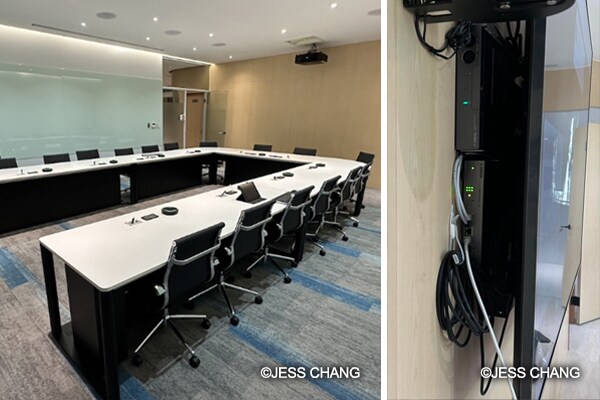 An RM-CG ceiling array microphone is installed in the video conference room for senior executives. The Dante-compatible unit is equipped with a four way auto-tracking beamforming array and unique digital signal processing (DSP) technologies. These allow it to automatically detect who is speaking and pick up the sound from that area, while reducing unwanted noise from other areas, such as papers and cups being moved.