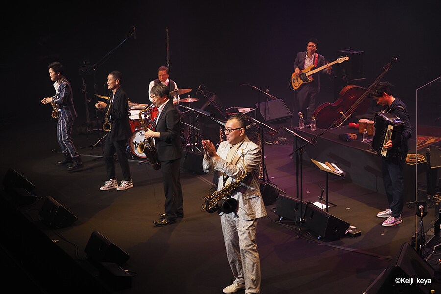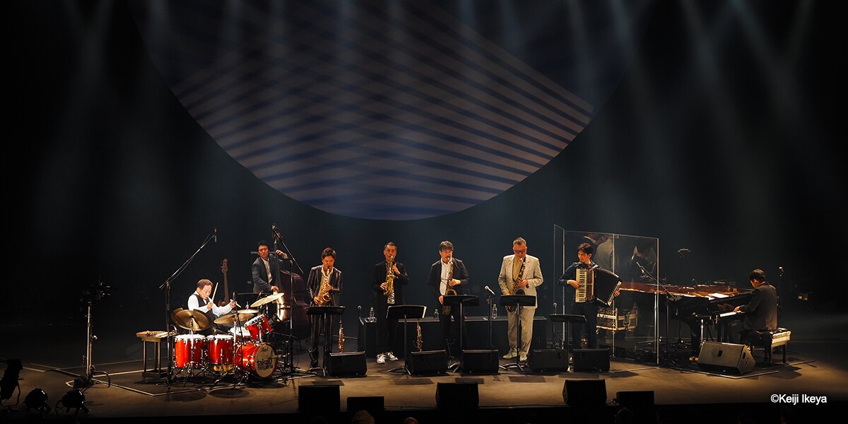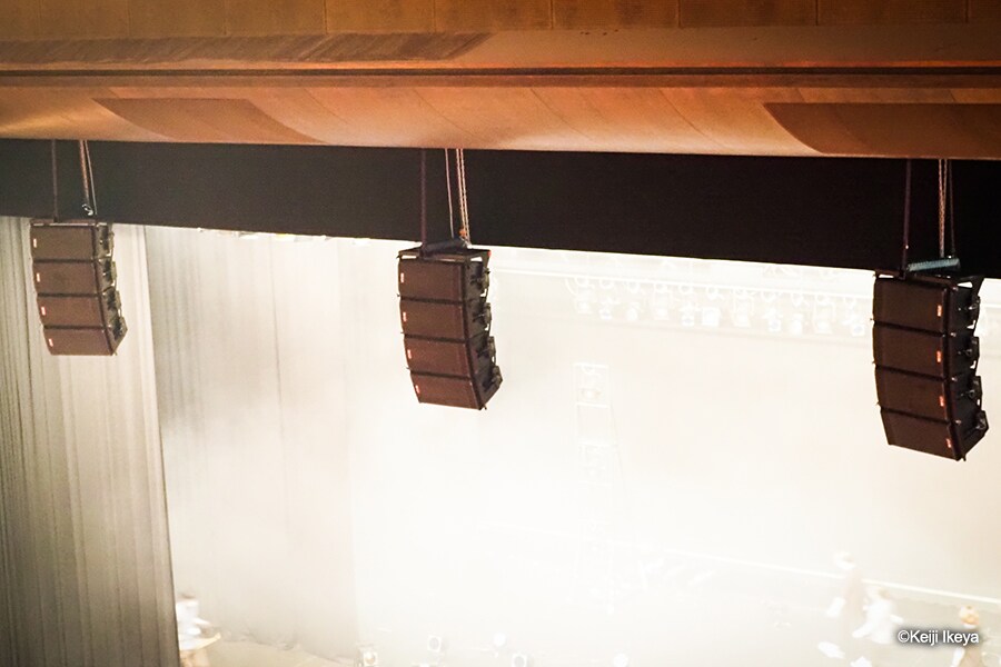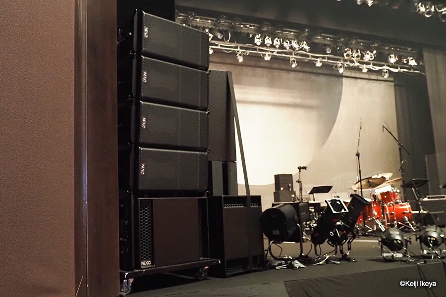 A 2023 Takeo Moriyama Jazz Night, bal, közép és jobb arrays hangfalak- mindegyik négy kompakt NEXO GEO S1210 hangfalakból áll - a színpad felett biztosította az AFC Image rendszer megvalósulását.