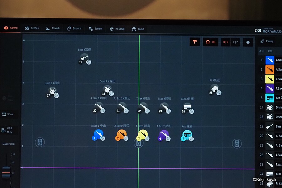 Az AFC Image minden egyes hangforrást mozgatható ’tárgyként’ kezel. A Takeo Moriyama Jazz Night esetében ez azt jelenti, hogy amint a szaxofon szólista a színpad közepére megy, Toyoda az AFC Image vezérlő táblagép érintőkijelzőjén valós időben követi a szólista mozgását.
