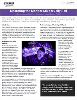 J. számára a Jelly Roll monitor hangmérnökeként háta mögött már sok-sok év szakértelemmel rendelkezik, előre nem látható kihívásokat oldott meg és követi a folyamatosan változó hangosításban rejlő problémákra a megoldásokat. Summers teljes felszereltséggel, a 'bármire fel kell készülni' hozzáállással közelíti meg a munkát annak érdekében, hogy a legjobb minőséget tudja biztosítani. „Nincs jobb érzés, mint amikor a művészek elégedetten mosolyognak.”