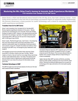 Brian Frost váltása a CL5-től a Yamaha DM7-ig, és az innovatív Dante hangmérnöki felhasználása, teljes mértékben megmutatja alkalmazkodóképességét. A csúcstechnológia ilyen kiváló integrációja Brian munkamenetébe tovább bővítette technikai tudását és hírnevét, mint a szakma úttörője erősítette meg.