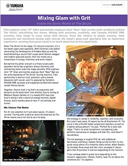 FOH engineer John “J3” Allen and monitor engineer Zach “Bear” Bair are the sonic architects behind The Struts’ electrifying live shows. Mixing with precision, creativity, and Yamaha RIVAGE PM5 consoles, they adapt to every venue with finesse. From mic choices to plugin mastery, their teamwork and emotional mixing style elevate the band’s glam-rock spectacle into an immersive experience—proving that great sound is as much about feel as it is about tech.
