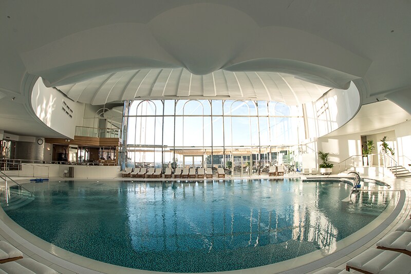 The spa and fitness club includes two heated indoor seawater pools plus a cold pool, high specification gymnasium and cardio fitness room, male and female saunas, solarium and jacuzzi.