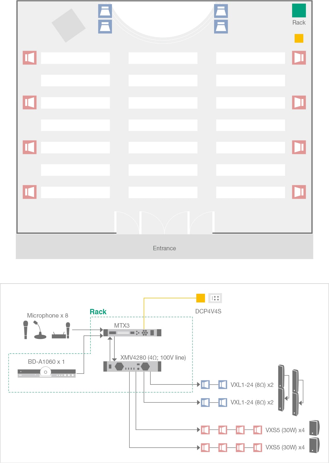This type of request is commonly found in house of worship or some educational facilities. In such an environment VXL series slim line arrays are the best choice as main front speakers for both auditory and visual reasons, delivering clear and well-defined sound in reverberant rooms. Here in the example each two VXL speakers are vertically connected to increase SPL and expand projection to ensure audience at the very back to hear the sound. Coverage is maximized and dead spots eliminated by placing VXS5 speakers on the left and right sides of the room. This arrangement provides clear sound for everyone present. The MTX matrix processor includes a Feedback Suppressor function that is also useful in this application. An appropriate setup that has been pre-programmed using the MTX-MRX Editor can be recalled via a single button, instantly setting up the system for central control. Day-to-day volume adjustment can be conveniently carried out via DCP control panels without having to operate the MTX processor.