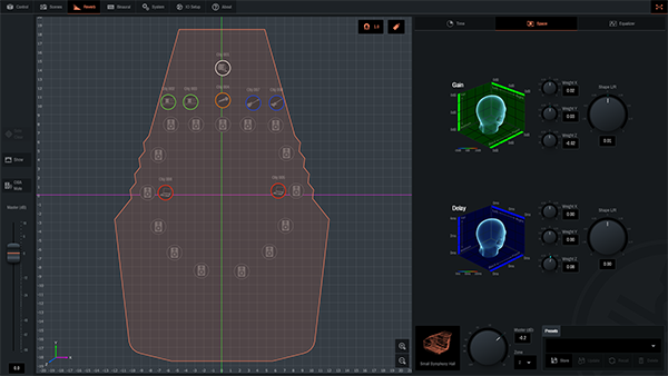 The dimensional reverberation control capabilities of AFC Enhance can be used to create acoustic spaces in which acoustic images are positioned and moved around by AFC Image using a sophisticated but intuitive GUI. AFC Enhance controls the reverberation of a space while making use of the natural acoustic properties of the existing structure. Unlike approaches that add artificial reverb to the source sound to create a different impression, AFC Enhance employs technology developed over many years to control sound propagation within the actual space so that reverberation and volume can be altered while the natural sounds of musical instruments and voices are maintained. AFC Image allows users to control the perceived positions of acoustic images within a space. With a conventional stereo configuration, the acoustic image will vary according to the listener’s position. Immersive systems, on the other hand, allow acoustic images to be placed and moved wherever they are needed to produce the desired effect, and their position remains absolute regardless of listener location. There are many features that makes AFC Image unique, such as a speaker zoning function that assigns object sounds to only the desired speakers within the system, and binaural output that lets users experience the immersive sound in headphones. Systems can be flexibly created according to customer needs, allowing easy integration of DAWs, mixers, tracking systems, plus other third-party hardware and software.