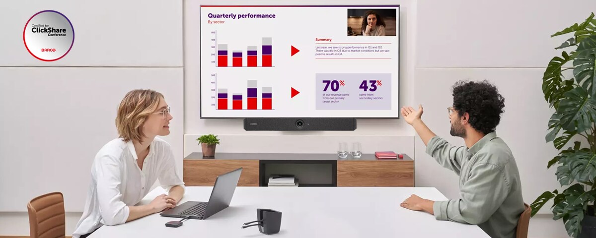 ClickShare Conference, Barco’s wireless conferencing solution, shares the apps from a user’s laptop onto the meeting room screen and wirelessly connects a user’s video call with the camera and speakers of the room such as the CS-800 Video Sound Bar.