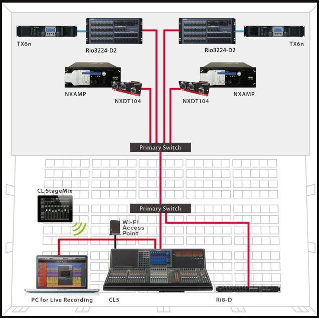 The complexity and variety of today’s live sound systems makes fast, adaptable configuration and setup capability vital. Of course the highest level of sonic performance must be maintained at the same time. CL series consoles use the Dante network protocol developed by Audinate to allow flexible connection to multiple I/O rack units configured and located according to the needs of the application, while at the same time providing redundancy for superior reliability.