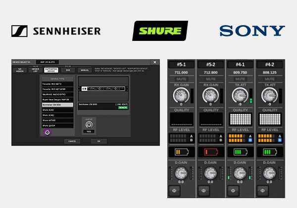 With V5.0 firmware or later, RIVAGE PM consoles support control and monitoring of the highly popular wireless receivers on the market, giving you even more freedom when operating sound systems built around a RIVAGE PM series product.