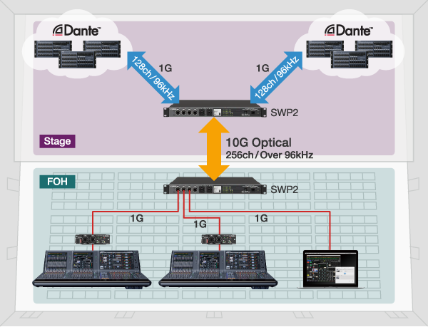 The SWP2 series equips the 10G uplink optical ports, allowing operation without fear of insufficient bandwidth even on a Dante network that is set to a sampling frequency of 96 kHz. It is a scalable solution that grows with a 96kHz Dante network system with the large number channels.