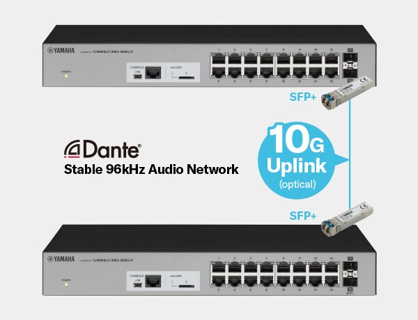 With high port counts and 10G uplink ports that can be used to transfer multichannel 96 kHz data over extended distances, the SWR2310-28GT and SWR2310-18GT switches have been designed to support safe, stable network operation in system backbone applications. Optional SFP-SWRT-SR and SFP-SWRT-LR small form-factor pluggable modules allow reliable long-distance communication of multiple channels of 96 kHz audio data, up to a maximum of 10 kilometers with the SFP-SWRT-LR, significantly enhancing performance, dependability, and flexibility for commercial installations, theaters, stadiums, and other large-scale installations.