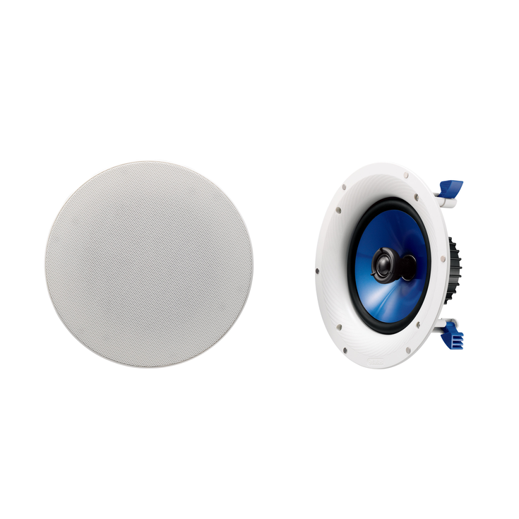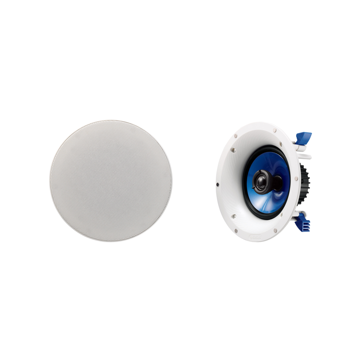 8-Zoll-Koaxial-Deckenlautsprecher mit Konus-Tieftöner, fluid-gekühltem Gewebe-Kalottenhochtöner, 140 W Leistung, hornförmiger Schallführung und einem dünnen, leichten Schutzgitter mit Magnethalterung
