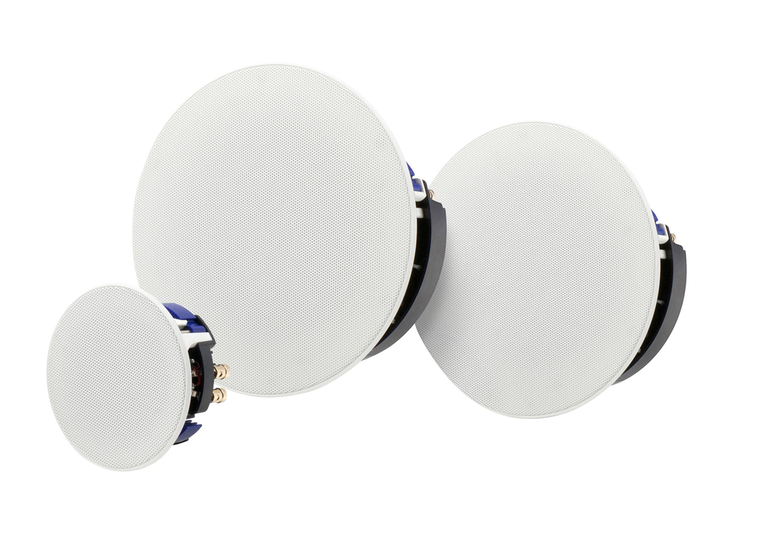 A 6-1/2" coaxial ceiling speaker with double voice coil cone woofer, two fluid-cooled soft-dome swivel tweeters, 120W power handling, horn-shaped acoustic baffle and thin, light grille