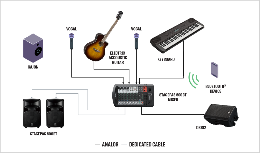 It features an intuitive interface that users with limited, or even no sound reinforcement experience can operate easily. In this example we've combined the STAGEPAS600BT with a small subwoofer to give some extra impact to your event. There are smaller and larger versions of STAGEPAS to suit different applications - so be sure to check out the other options!