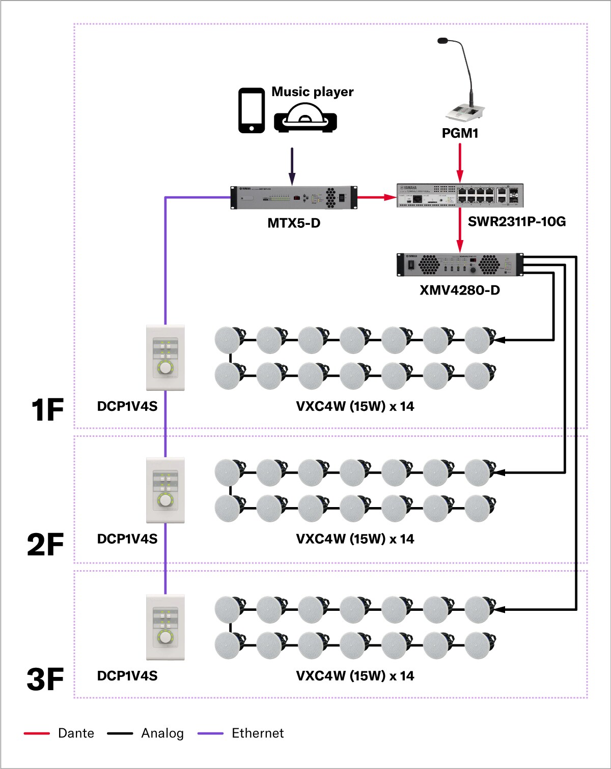 If the area is spread over more zones, or if there are more speakers per zone, use the XMV series of higher output multi-channel power amplifiers. This allows a single system to complete a large institutional store or shopping mall.