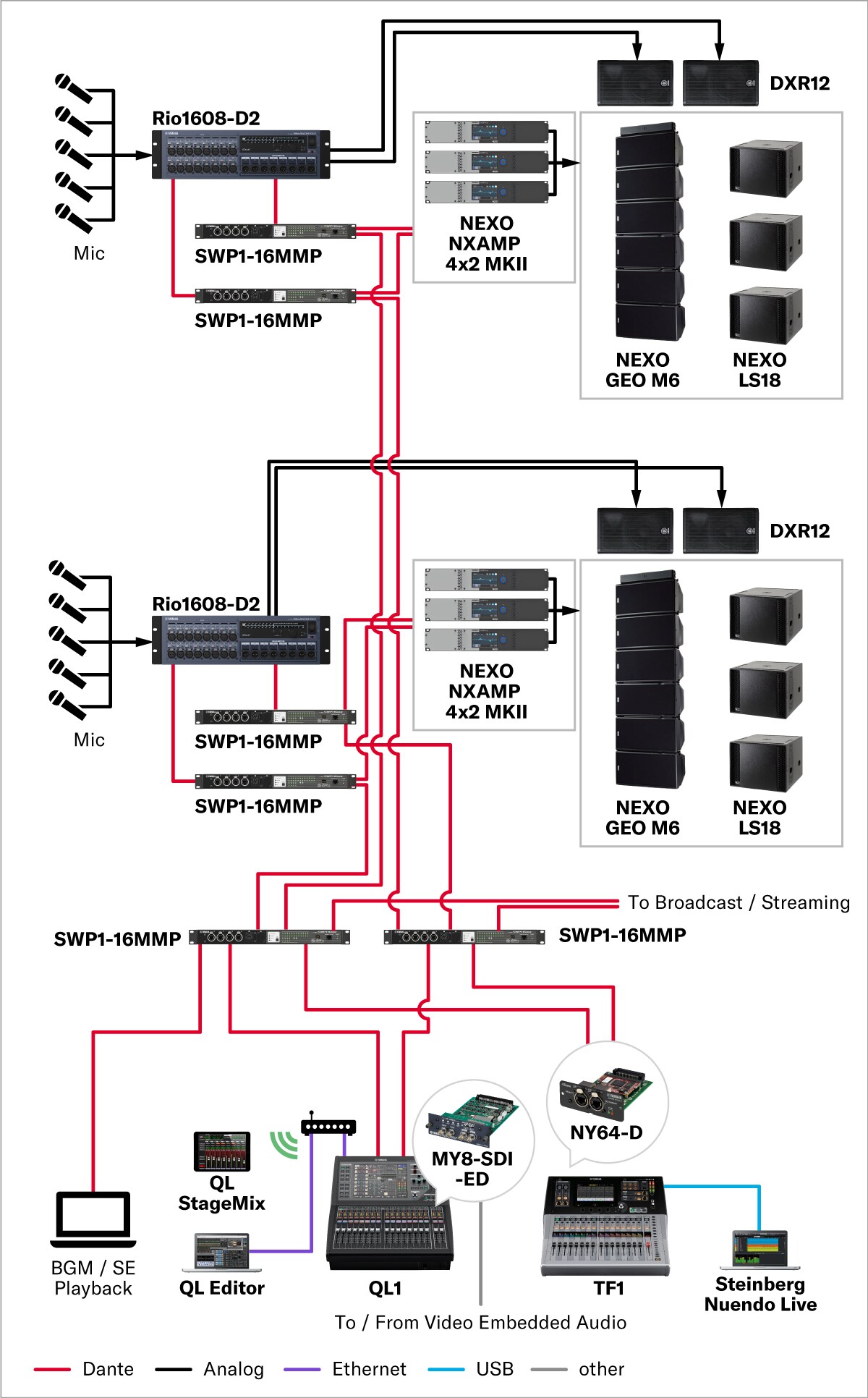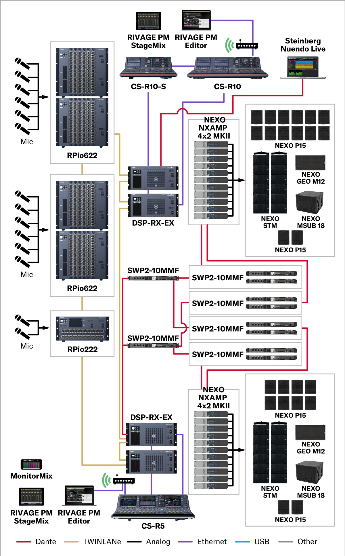 This system is suitable for live concerts in outdoor venues for up to several thousand people. A compact yet powerful mixing console capable of sophisticated, large-scale setups combines with high-quality speakers capable of output levels that bely their diminutive size and weight to deliver clear, consistent, and powerful sound to the entire audience. System configuration, routing, and connectivity is simplified significantly through the use of an audio network which enables operation by a small number of people and reduces the time and labor required for system set up and tear down.