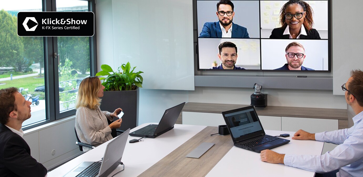 KLICK&SHOW K-FX transforms conventional conference rooms into hybrid meeting rooms, facilitating collaboration between the office and home office.