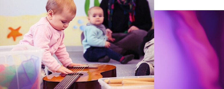 Every week topics taken from everyday life are covered e.g. bathing, changing nappies, putting to sleep, eating, moving, teething, learning to speak, illness and birthdays. By using music, playing simple musical instruments, using toys and other everyday objects the learning process is supported in a varied and child-oriented manner.
