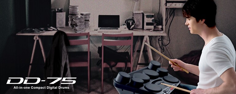 DD-75 is a digital drum kit with eight touch-sensitive pads and two foot pedals. High quality drum and wide variety of percussion sounds from all over the world are mixed with orchestra voices to provide a wide range of musical opportunities. AUX IN jack lets you connect and MP3 player and play along with your favorite music.