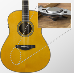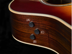 The battery box is integrated into the end-pin jack, requiring fewer holes in the body and thus reducing acoustic sound loss. Connect a cable from the jack to a PA or amp to use the TA instrument as an acoustic-electric guitar.