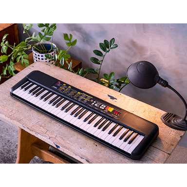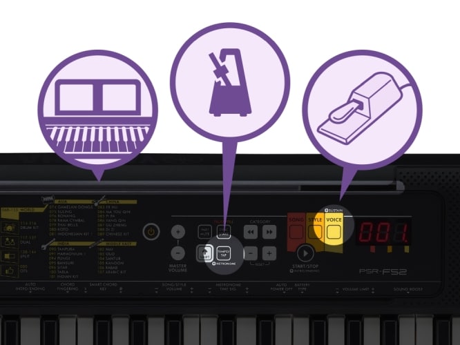 The PSR-F52 includes a music rest as well as features that take the place of physical objects needed to start playing the keyboard, namely the Sustain function that acts as a sustain pedal for longer decay, and a built-in metronome for developing a sense of rhythm. The free downloadable Song Book and more, the PSR-F52 provides the aids for beginners.