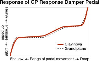 The damper pedal is an important piano-playing element because it continuously varies the sound as you press it down. The Clavinova provides acoustic piano behavior by constantly detecting the amount of pedal travel and finely adjusting the amount of note elongation and reverberation. Additionally, the GP Response Damper Pedal reproduces the typical grand piano feeling, for example less resistance when starting to press and a heavy feeling when the pedal begins to take effect. As a result, players achieve greater control when operating the damper pedal.