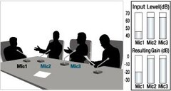The Dugan-MY16 uses the innovative Dugan Speech System™ to control gain, distributing microphone gain across the entire system in order to retain the natural ambience of a single microphone.This remarkable system achieves automatic mixing without distracting level changes, inconsistent ambience, or other problems associated with automatic mixing using noise gates.The illustration shows the input and gain levels for three microphone inputs.